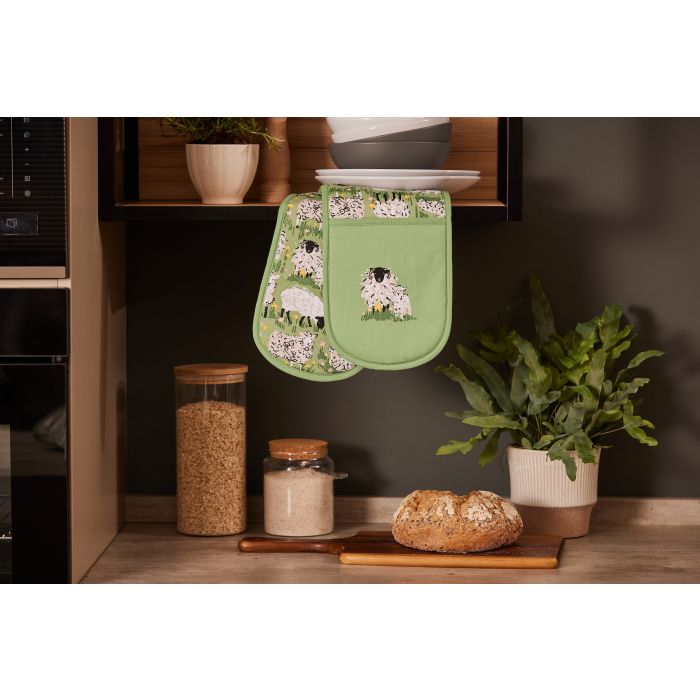 This Woolly Sheep Double Oven Glove brings pastoral charm when entertaining friends and family for large dinners! It features hand-illustrated sheep and their newborn lambs relaxing in a meadow full of flowers.