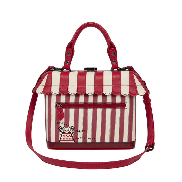 A sensational blend of our Vendula Circus and I-Scream ranges, the Skelecat's Travelling Ghost Circus Grab Bag is a dream come true for every Venghoulette! Crafted from vegan leather, this versatile piece can be carried by the handle, worn over the shoulder or crossbody. Featuring a secure clasp closure, generous interior space, and circus-themed detailing—including juggling mice, trapeze cats, and big-top stripes—this bag is an attention magnet. Bonus points for the exclusive lining and the perfect matching wallet!