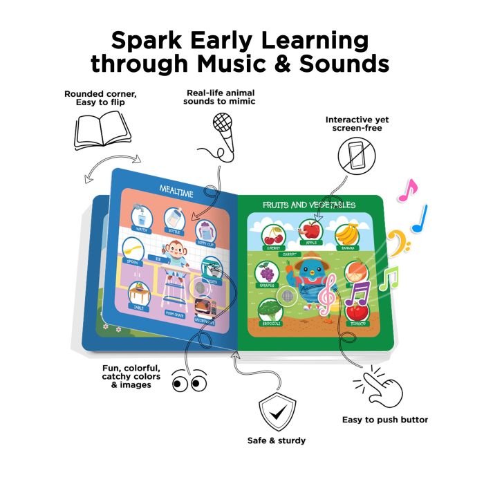 12 sound buttons to explore: In the garden; On the farm; Toys; At home; Clothes; Outside; Mealtime; Fruits and Vegetable; Vehicles; Birthday; Body and Feelings 'How are you today'?
